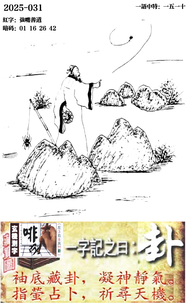 031期跑狗一字記之曰:【卦】 袖底藏卦,凝神靜氣。 指螢占蔔,祈尋天機。